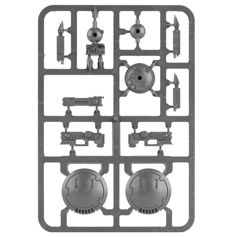 This multi-part plastic kit gives you everything you need to build two T'au Drones, highly-advanced and highly-mobile automata of the T'au Empire. You have the option of assembling any two of the following - one shield drone, one marker drone and one gun drone. Eleven components are included, with two Citadel small Flying bases.