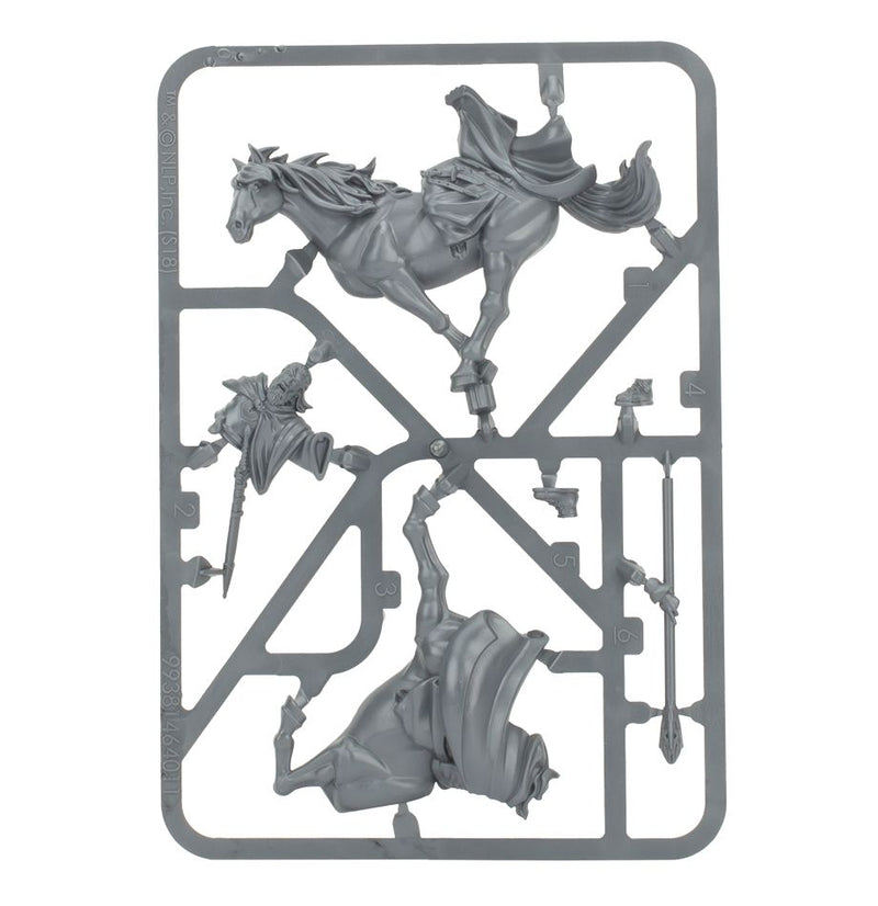 This multipart plastic kit contains the components necessary to assemble Gandalf the White and Peregrin Took, both on foot and mounted on Shadowfax. When mounted, you have the option to remove Peregrin Took, leaving just Gandalf on Shadowfax. On foot, Gandalf wields Glamdring and his wizard’s staff, while Peregrin Took is clothed in the uniform of the Citadel Guard of Minas Tirith with his helmet in his left hand.