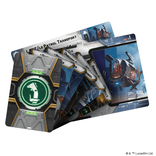 Within this expansion, players will find everything needed to add a LAAT/Ie Patrol Transport to their Republic or Imperial armies. The beautifully detailed, unpainted hard plastic miniature can be assembled with either Phase II clone pilots or Imperial TIE pilots, and unit cards for both factions help players fully integrate them into their forces. In addition to these cards, 12 upgrade cards invite players to customize their LAAT/Ie with unique pilots from both factions as well as ordinance and comms systems.