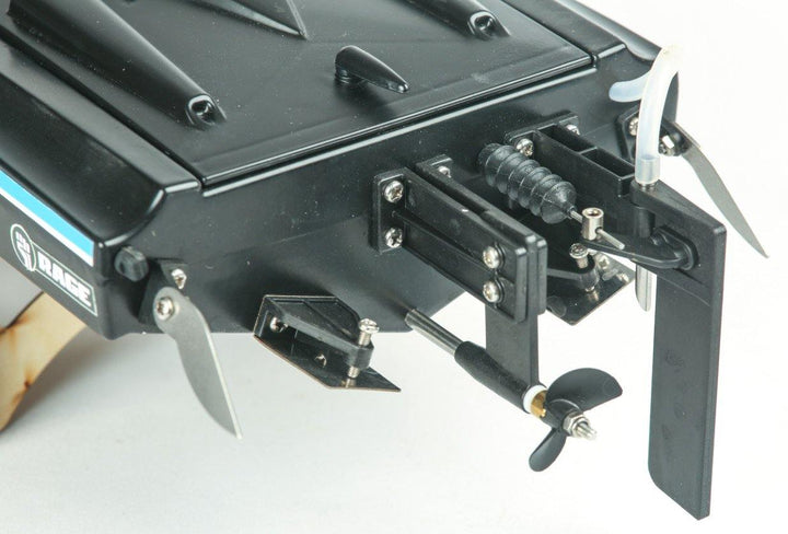 The Black Marlin BL is a RTR (Ready-To-Run) boat that arrives 100% factory-assembled out of the box with a 2-channel, 2.4 GHz radio system that features fully proportional steering and throttle control, a 17gram water-proof servo, and a convenient DC charger with an AC power supply that plugs into any electrical outlet. The BL comes with a display stand that proudly shows it off when in dry dock. Even the AA transmitter batteries are included, so the Black Marlin BL can be racing across a local pond or lake within minutes of opening the box!