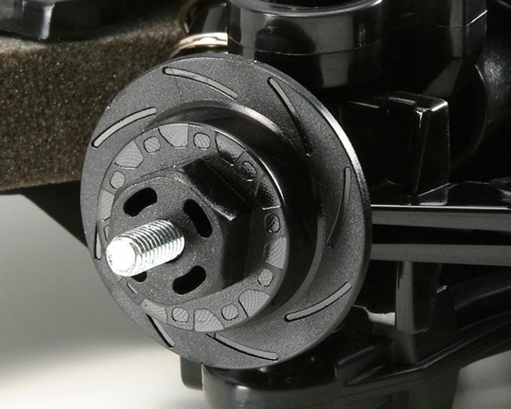 The shaft-driven 4WD TT-02 chassis employs a longitudinal layout with the battery on the left and the motor on the right, to give excellent stability. In addition, it features identical left and right suspension arms and uprights for ease of assembly, plus easy-to-maintain gearboxes. It is a highly adaptable chassis, as it offers 2 different wheelbases, 2 ground clearance settings and 2 tread set-ups in addition to a range of 10 possible gear ratios. It is not short on looks either, with brake disc-shaped wheel hubs and stylish front bumper supports. Gold color fin-spoke wheels are paired with rally block tires.