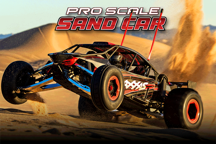 Driving a sand car is an adrenaline-fueled thrill ride like nothing else on Earth. Outfitted with 1000+ horsepower engines and long-travel suspension systems, sand cars can top 150 mph and wheelie with just a blip of the throttle. The new Traxxas Pro Scale Sand Car is a 55+mph replica purpose-built to deliver the same raw excitement and thrill of driving the full-size Funco car in dramatic X-Series™ scale.