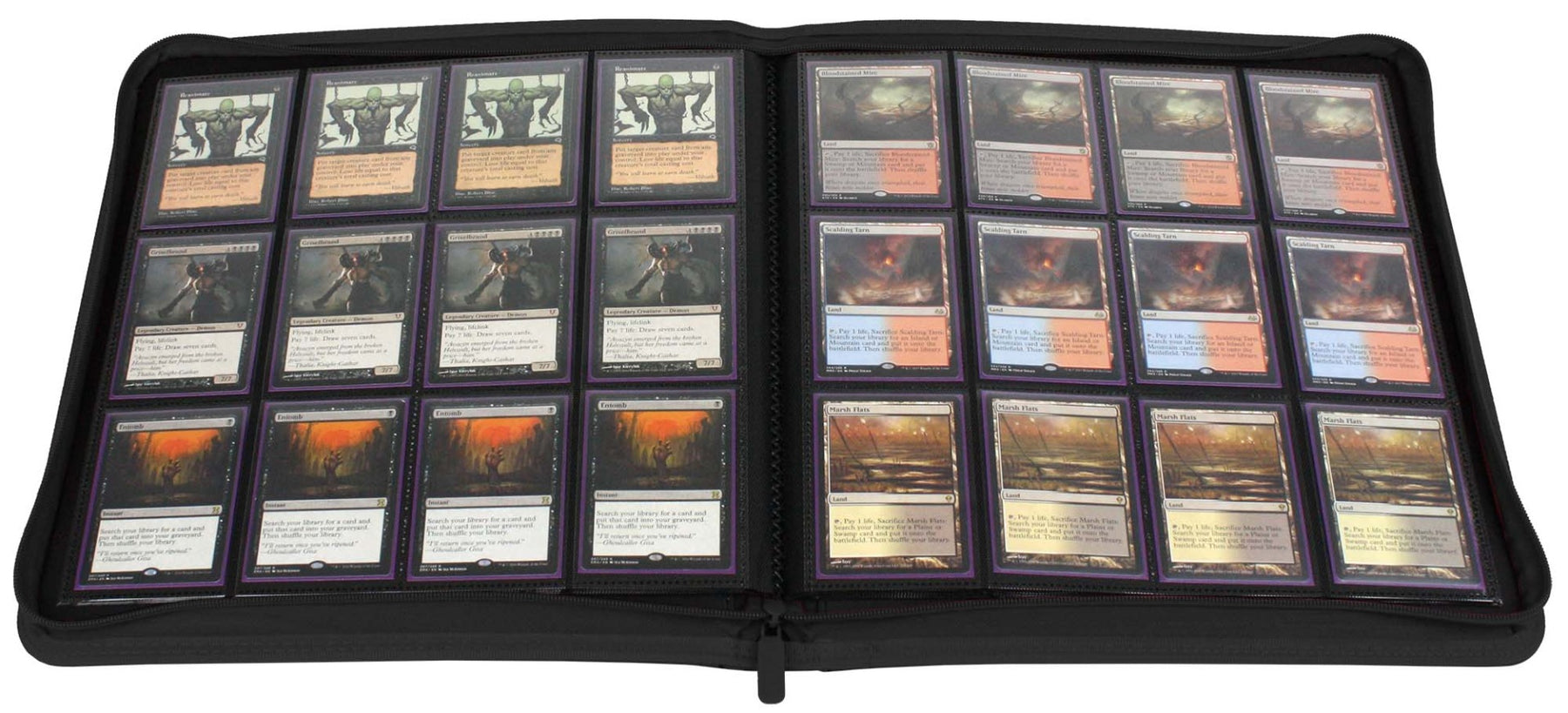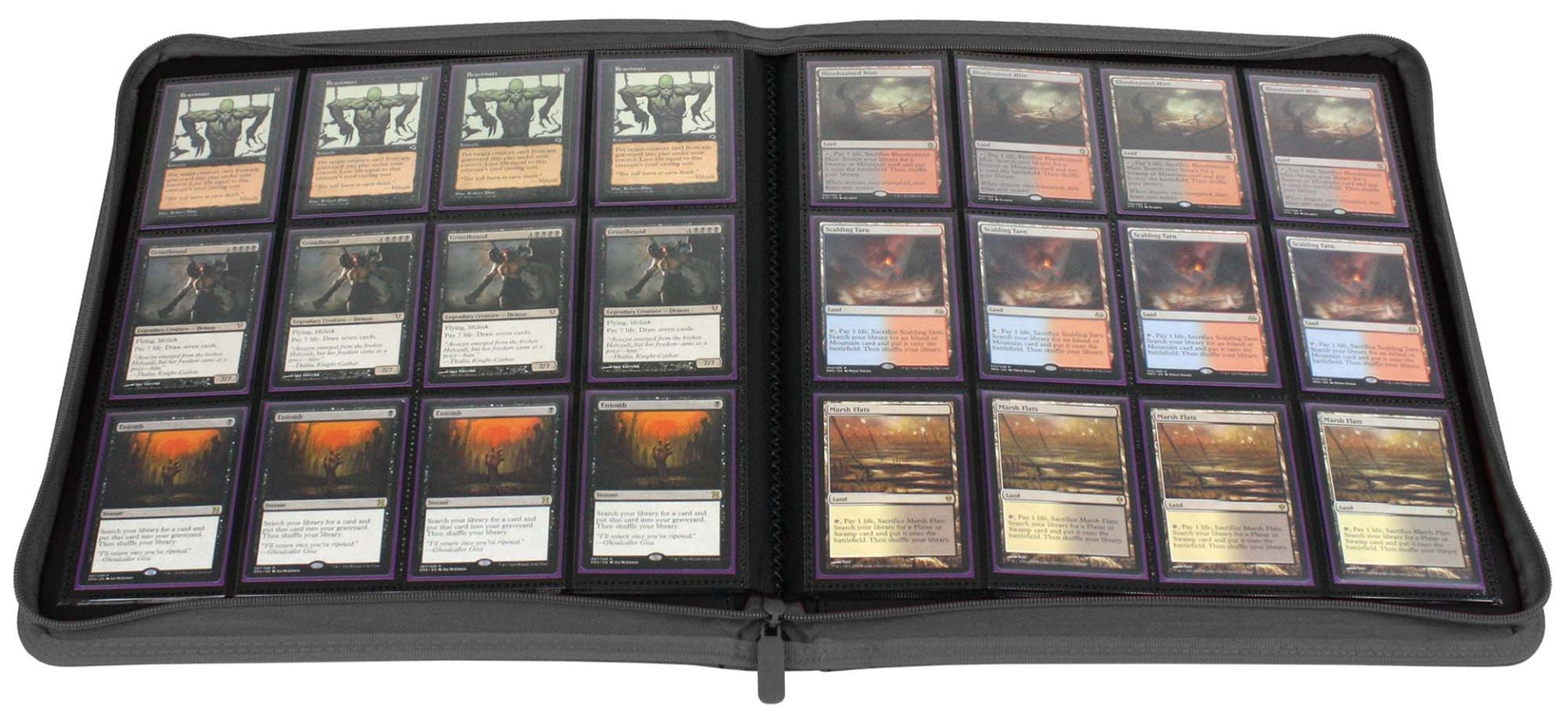 The BCW Zipper-Folio-LX will accommodate 480 cards and features a padded leatherette front and back cover with contrasting colored stitching and wrap around zipper. Side-loading pockets deter the cards from sliding out of place. The 12-pocket pages are ideal for arranging cards in playsets of four. It works great for sports cards, trading cards, and gaming cards and accommodates cards in soft-sleeves, Deck Guards, and double-sleeved Deck Guards. Our premium, double-sided, archival safe polypropylene pages will not harm the cards stored within and offer an attractive method to both store and display your collectibles.