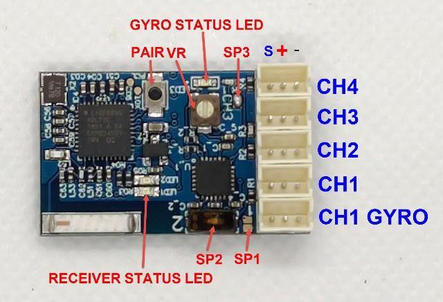 SP3: Transmitter channel 3 control adjust GYRO sensitivity select, solder point connected is Transmitter channel 3 control GYRO sensitivity, solder point not connected is VR control GYRO sensitivity