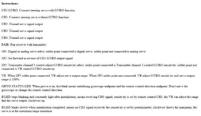 GRYO STATUS LED: When power it on, fast blink means initializing gyroscope midpoint and the remote control direction midpoint. Don't move the gyroscope or change the remote control direction. If LED stops blinking and constantly light after initialization, means receiving CH3 signal, sensitivity is set by remote control CH3, the VR can adjust the range that the servo output, clockwise up. If LED blinks slowly when initialization completed, means no CH3 signal received, the sensitivity is set by potentiometer, clockwise shows the maximum, the servo is at the maximum range meantime.