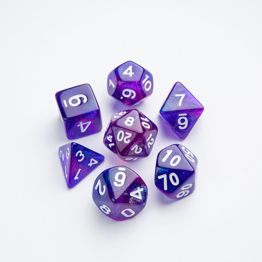 Choose your weapon! This dice set contains a D4, a D6, a D8, two D10 (10 and 00), a D12 and a D20. All dice are round-cornered and manufactured at a premium level. The Galaxy range is the exciting fusion of two or more cosmic colors, creating unique looks with the addition of glittering elements. They are packed in a window cardboard box that displays all dice at the front.