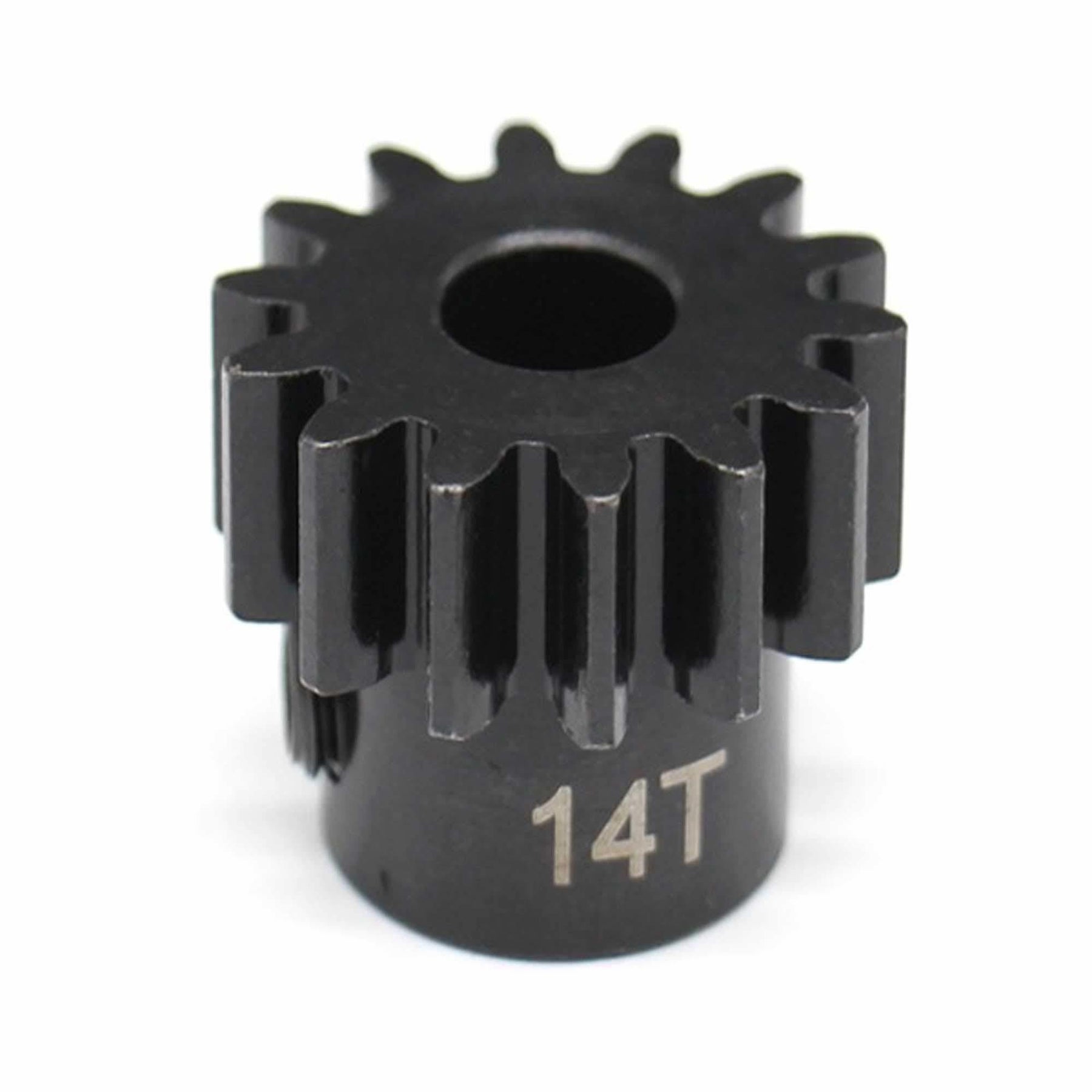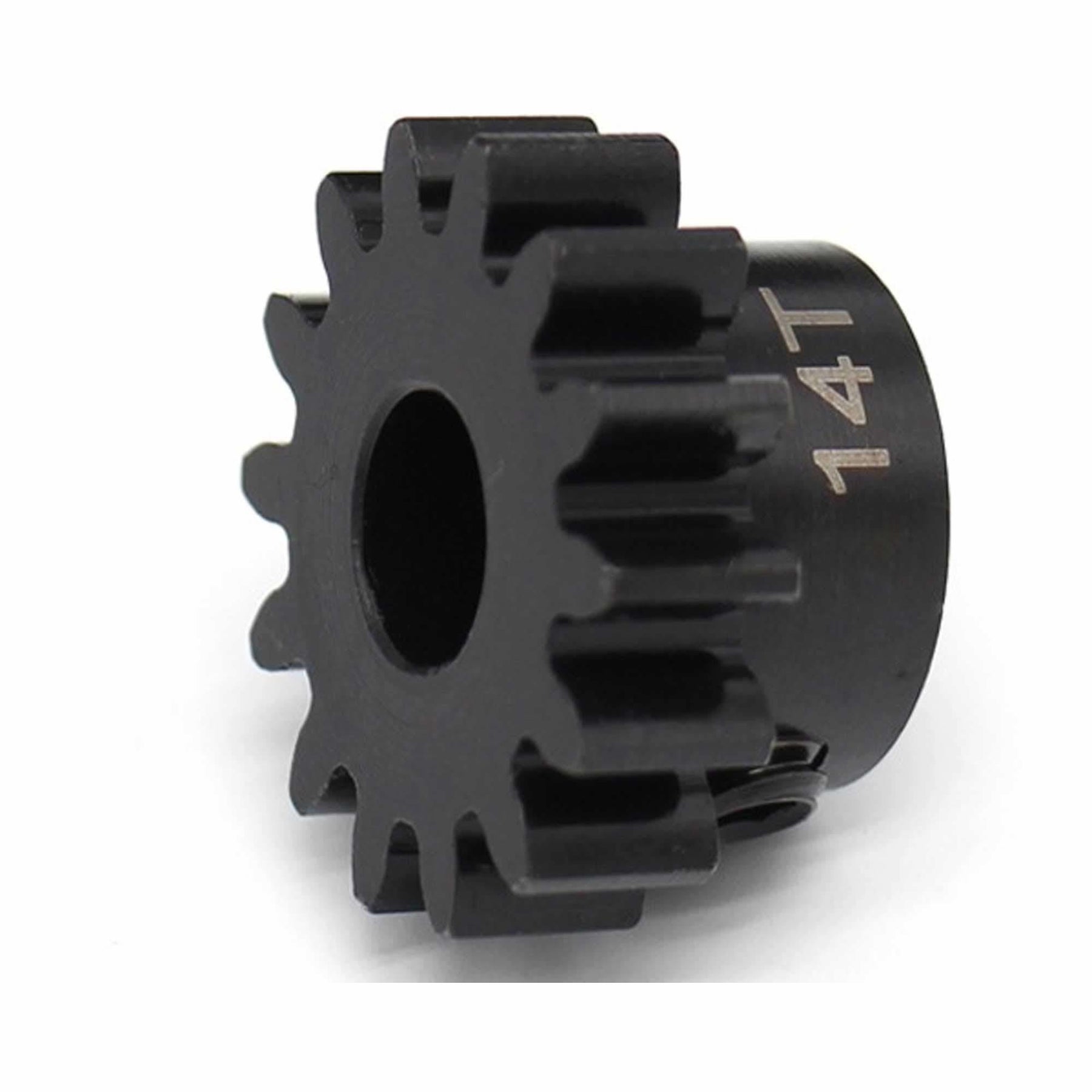 Hardened steel 14T Mod 1.5 pinion gear with an 8mm bore for Large scale vehicles, or other various applicationsFEATURES: - Hardened steel- Black oxide coating enhances corrosion resistanceYOU WILL RECEIVE: - One (1) 14T Mod 1.5 pinion gear- One (1) M6x6mm setscrewREQUIREMENTS: - Medium thread lock (blue threadlocking compound) for setscrew- 3mm hex wrenchSPECIFICATIONS: - Teeth: 14- Pitch: 1.5 module- length: 17mm- Face width: 8mm- Bore diameter: 8mmdescription revised by: SN June 13, 2018