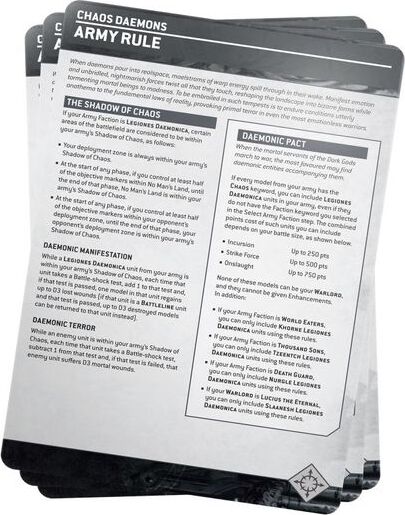 - 3x Chaos Daemons Index Cards, detailing the faction's army rule and the Daemonic Incursion Detachment
