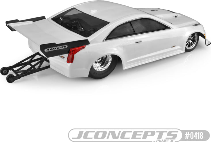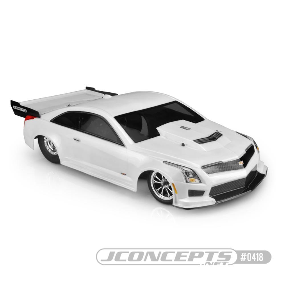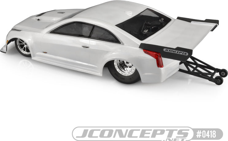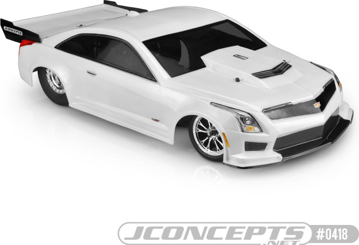 The ATS-V is Cadillac's vigorous, brawny contender, eager to represent against all other performance rides. JConcepts took on recommendations from racers and dove into a new project utilizing the coupe style vehicle for the drag racing community. The Cadillac features a V-forged front-end with details chiseled into the headlight area which draws up the fender and over the hood. Undercuts throughout the nose culminate at the bottom with built-in splitter and recess vents.The grille as detailed with the included decal sheet allows the edginess of the Cadillac style to stand out and look massive. The included front hood-scoop brings a drag racing flair and blends up to the gradually shaped windshield with class. The roof is slightly railed, channeling the air over the rear-end and coupe section down to the trunk-lid. Fender flares protrude from the main body shape blend into the railed and splitter along the rocker-panels.The rear trunk cover fits and flows around the back