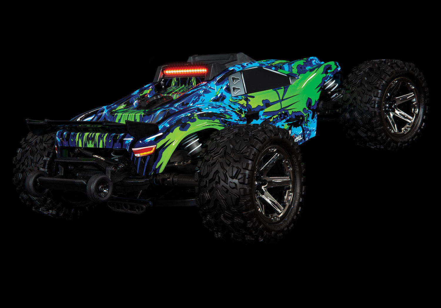 The Traxxas Rustler 4X4 takes stadium truck performance to new heights. The all-new High-Output Off Road LED light kit for the truck lights the way with high-intensity LEDs integrated in a new front bumper and roof skid. These pieces are made from our toughest composite material, and feature two forward facing bright-white LED light bars along with rear light bar in brilliant red. The system is regulated by an all-new chassis-mounted power supply for reliable lighting on all battery voltages. Built Traxxas Tough and fully waterproof, the Rustler 4X4 LED light kit keeps the fun going past sunset to add a new dimension to the Rustler 4X4 experience.