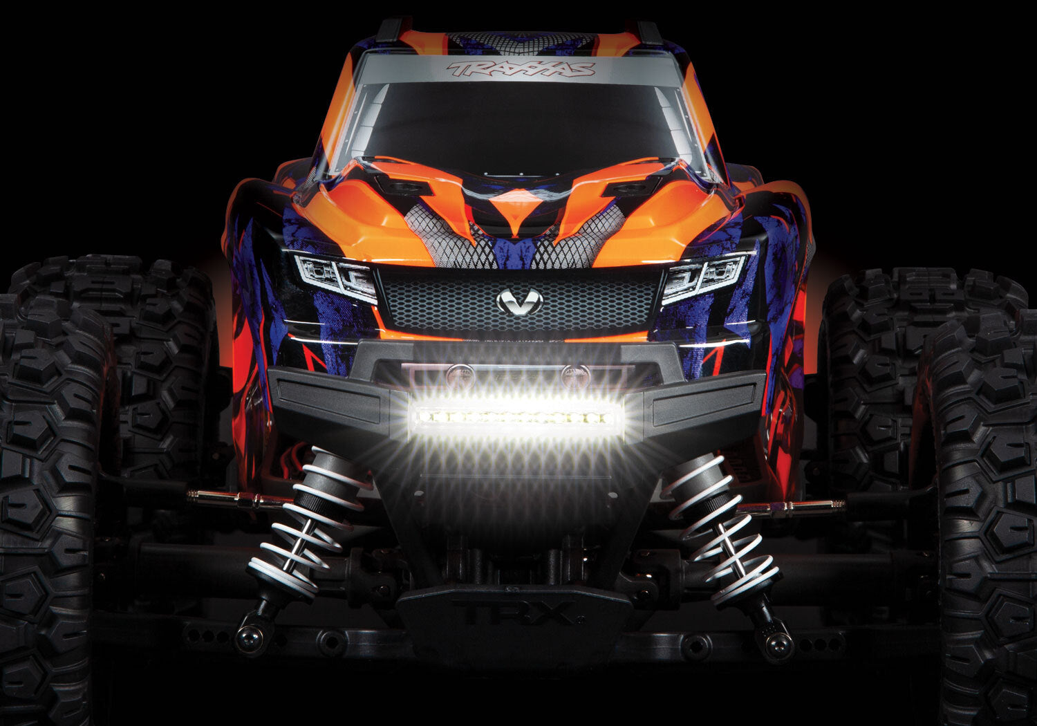 The Traxxas Hoss 4X4 unleashed a new era of extreme monster truck fun and now there's a LED light kit built to the same standard. Designed to handle the toughest action and most extreme stunts, the Hoss high-output LED light kit extends your adventures long after dark. A front high-intensity light bar integrates into a new rugged front bumper while bright red tail lights flank the wheelie bar in the replacement rear bumper. A chassis-mounted power supply regulates the voltage for reliable lighting performance without dimming or flickering. Naturally, the entire system is fully waterproof to make your all-weather adventures a reality.