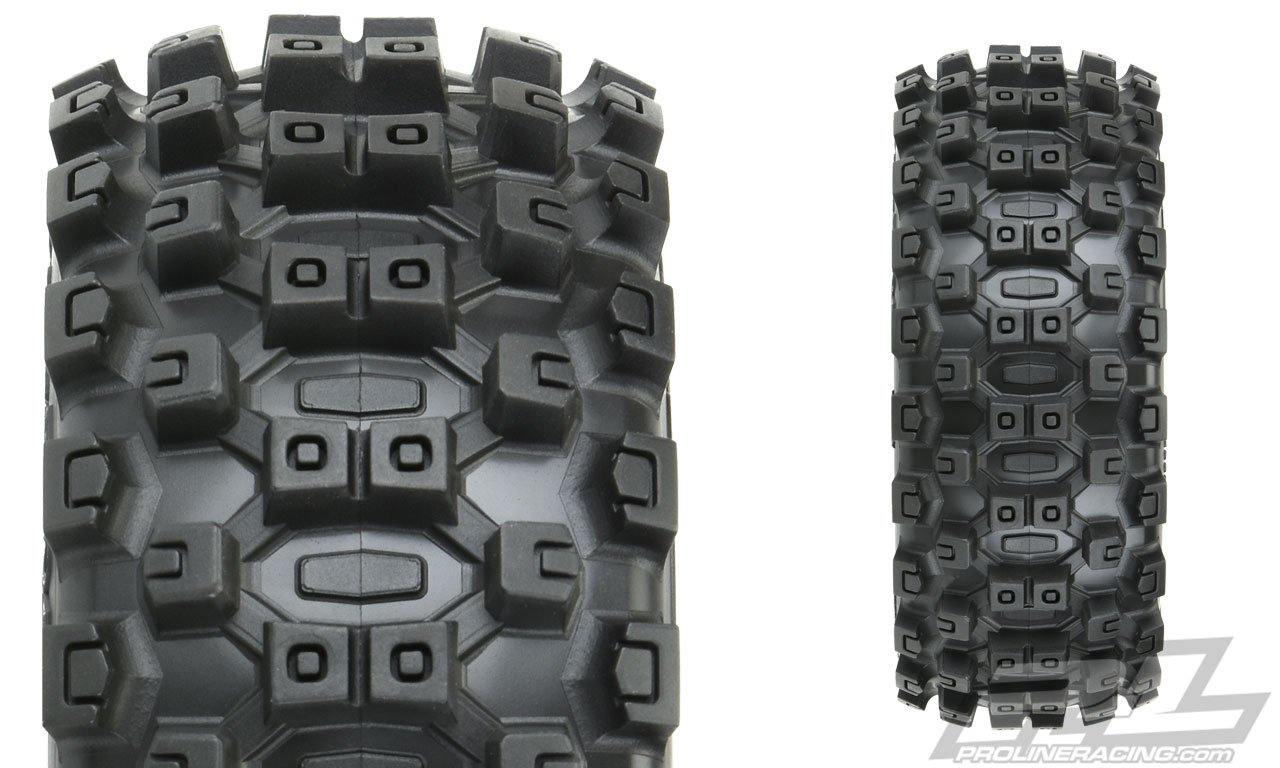 This is a pair of Pre-Mounted Badlands MX Tires for 1:8 Buggy. Pro-Line is taking the 1:8 Buggy tire game to the next level with the Biggest and Baddest tire ever conceived: the Pre-Mounted Badlands MX! Pro-Line Badlands tires are known for having sweet Motocross inspired tread and the all-new Badlands MX tires kick that up a notch with a Bigger and Bolder knobby tread that matches modern MX tire design. The Badlands MX is a true All-Terrain tire that will find traction on any surface but is best suited for loose & loamy dirt, mud, or grass. Just imagine your buggy throwing up huge rooster tails with these awesome looking tires!