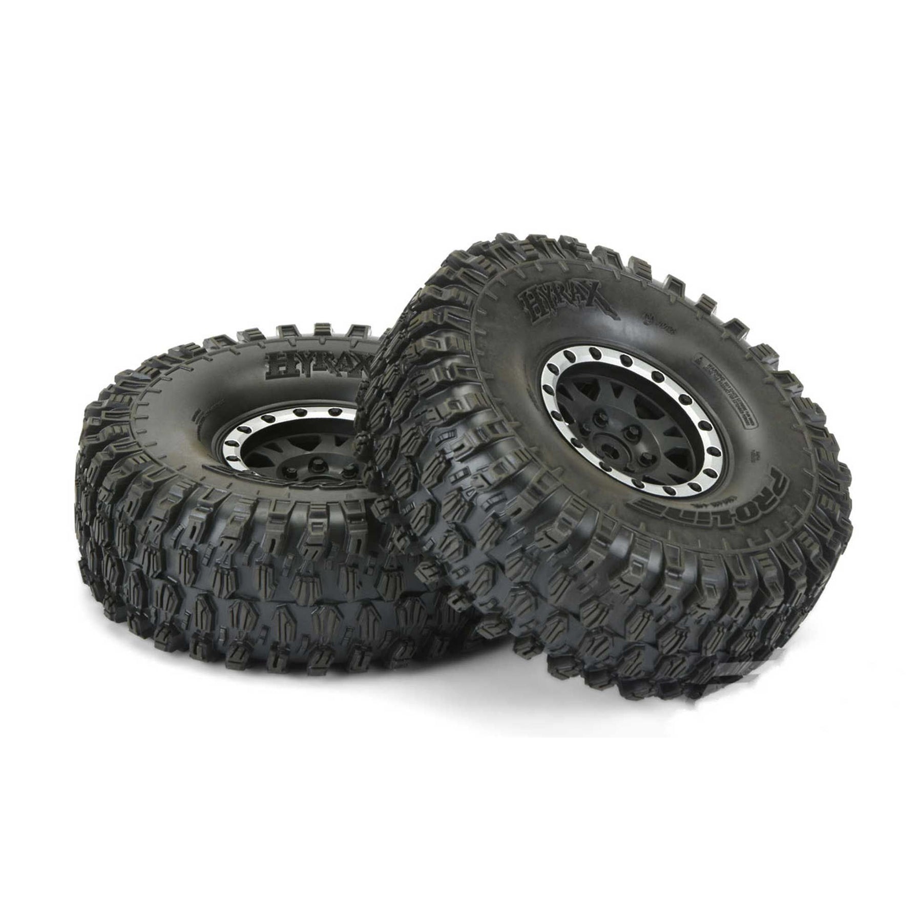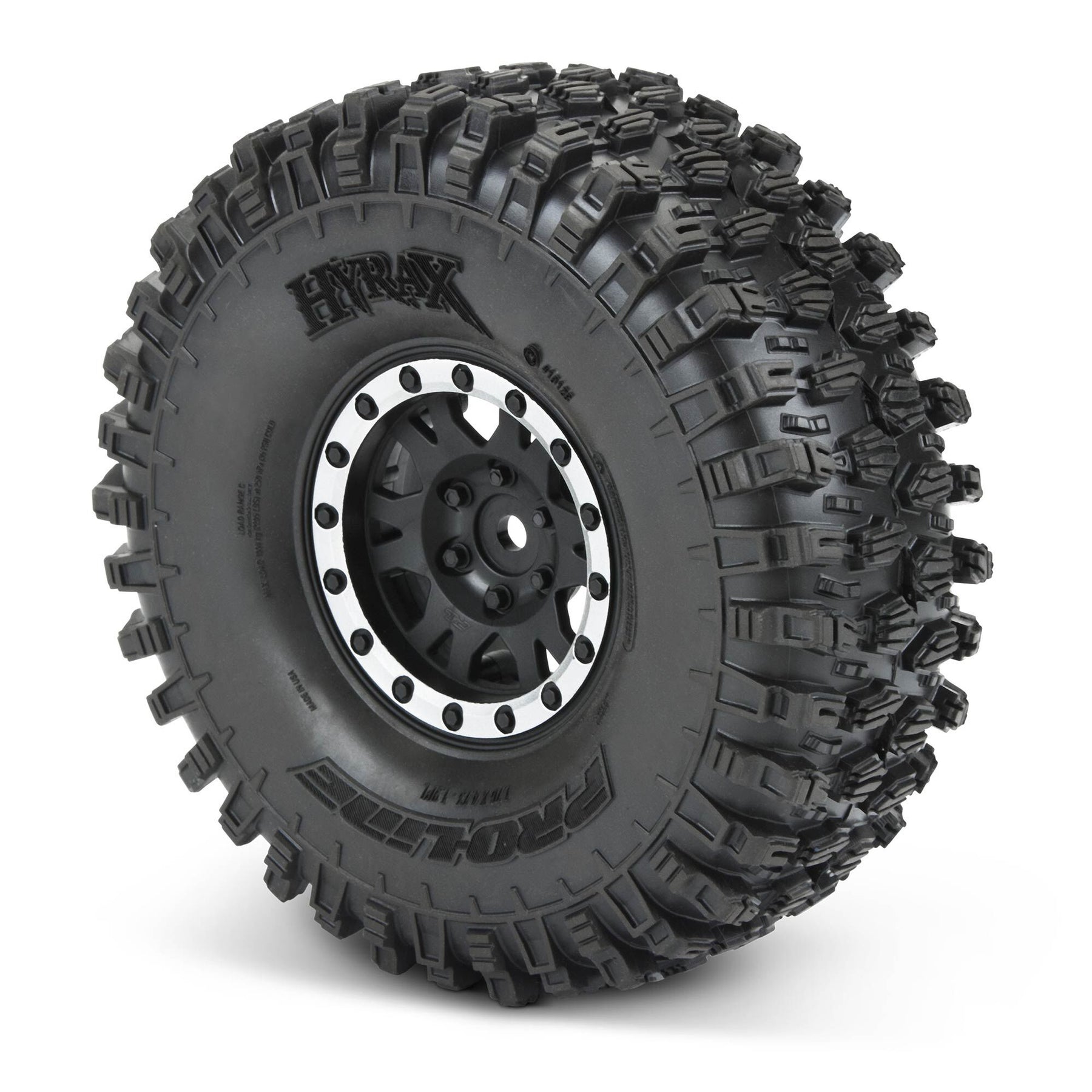 This is a pair of pre-mounted Hyrax 1.9" Tires. The future of 1.9" Tire Performance has arrived with Pro-Line's Hyrax Tire mounted to Impulse Black/Silver Wheels! Designed for maximum grip on the toughest terrain, the Hyrax tire is ready for anything your Scale Adventure might throw at you. The Hyrax features an aggressive and open tread pattern with each tread block containing multiple Sipes for incredible tread flex. The highly detailed connected tread on the sidewall of the Hyrax extends out for unmatched side-hilling performance. The Hyrax also features futuristic stepped tread blocks that create even more forward gripping edges that dig into slick rock like no other scale tire Pro-Line has produced to date! The Hyrax is made from Pro-Line's Legendary G8 material, so you know it provides the performance you can depend on.