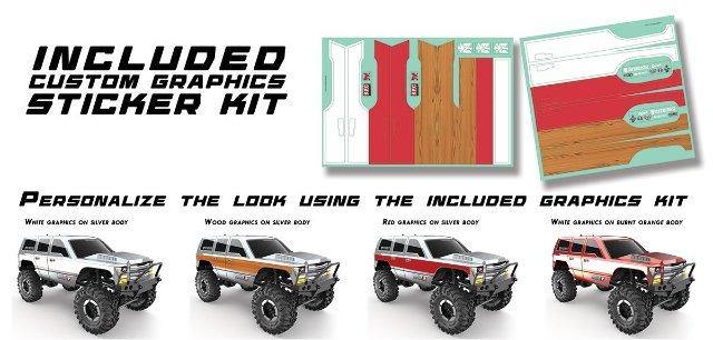 The realistic 4 door SUV body is similar to what you would find on many modern full sized crawlers. A high quality die cut decal sheet is also include with black, white, red and wood grain panel options so you can customize the Gen7 as your own, straight from the box. Shackle mount bumpers add even more realism and are ready to accept LED lights and mounts.