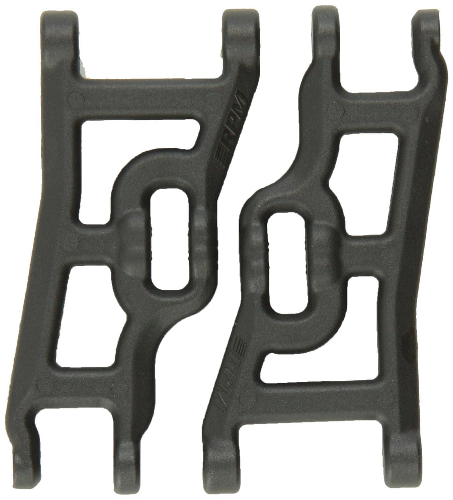 From the Manufacturer RPM front A-arms for the electric versions of the Traxxas Rustler, Stampede, Monster Jam and Slash are built to withstand some of the toughest abuse. Incredibly, we were able to shave some unwanted unsprung weight as well. RPM Front A-arms are nearly 25% lighter than stock versions of the same A-arms, yet the RPM versions are backed with our world- renowned breakage warranty. Additionally, we�ve increased clearance areas in the outer portion of the A-arms to allow increased droop travel when used in conjunction with RPM oversized bearing carriers (RPM 80372 & 80382). RPM front A-arms for the Electric versions of the Traxxas Rustler, Stampede and Slash are sold in pairs and are available in either black or blue. These A-arms are molded with what is fast becoming an RPM trademark design of angled leading and trailing edges to reduce frontal edge mass and improve the a-arm�s ability to ride up and over tall obstacles instead of slamming into them. RPM A-arms are extremely rigid for superior