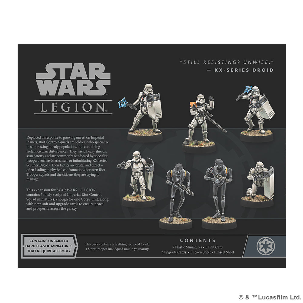 This expansion for Star Wars™: Legion contains 7 finely sculpted Imperial Riot Control Squad miniatures, enough for one Corps unit, along with new unit and upgrade cards to ensure peace and prosperity across the galaxy. The squad brings a mix of solid ranged combat using its e-11s with stronger durability and close combat power thanks to its electro batons and the protection offered by the squad's riot shields.