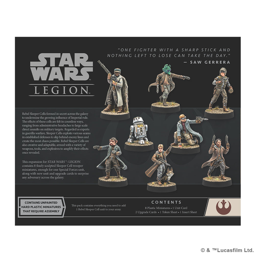 This expansion for Star Wars™: Legion contains 8 finely sculpted Sleeper Cell trooper miniatures, enough for one Special Forces unit, along with new unit and upgrade cards to surprise any adversary. The Rebel Cell uses stealth to close in on their foes where their assortment of demolitions and other sabotage work best.