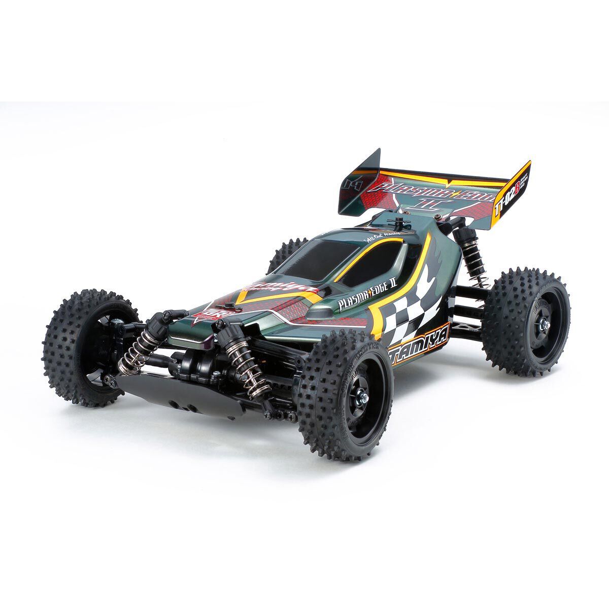 • The polycarbonate Plasma-Edge II buggy body is included. It comes pre-cut and painted in our special iridescent purple/green (Tamiya PS-46). Stickers are supplied for decoration, and require application.